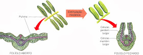 Quando estimuladas mecanicamente por um toque, as células da parte superior dos pulvinos li­beram íons de potássio, isso acarreta diminuição em sua pressão osmótica com consequente perda de água para as células vizinhas. A diminuição de turgor dessas célu­las provoca o fechamento dos folíolos. A reação de do­bramento das folhas da sensitiva propaga-se rapidamen­te da região estimulada para as folhas vizinhas, fazendo com que elas também se dobrem. A propagação do es­tímulo deve-se à despolarização das membranas celu­lares, provavelmente de modo semelhante ao que acon­tece na propagação do impulso nervoso nos neurónios dos animais, mas com velocidade bem menor.